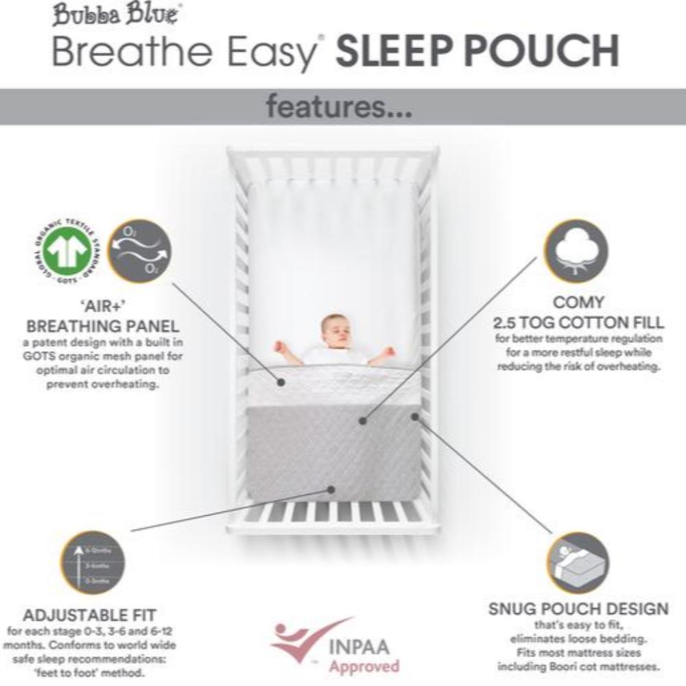 - The Bubba Blue Breathe Easy Sleep Pouch® features the AIR™+ Breathing Panel, on the top edge of the Sleep Pouch that lies across baby's chest. Made from GOTS certified organic cotton mesh & 3D spacer mesh for optimal air circulation for safety and comfort.