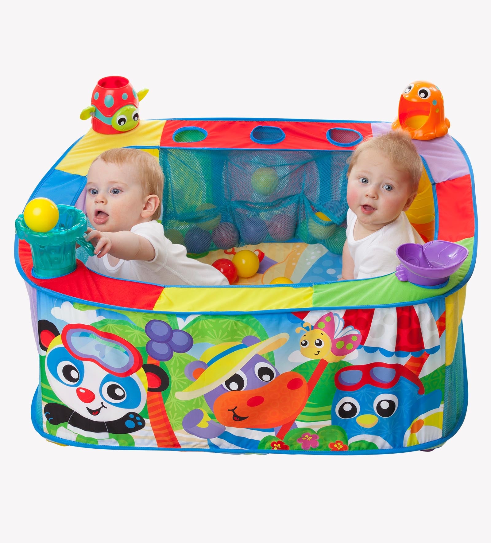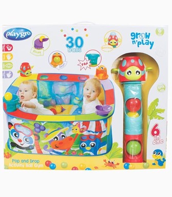 Drop and pop! The Pop and Drop Ball Activity Gym is a playgym bursting with 4 fun stations for baby to pop, drop or slide coloured balls in, out, down and around. With 30 coloured balls, there’ll be hours of fun for baby in this large ball gym. Vibrant patterns and engaging characters will visually stimulate baby and promote cognitive imagination. Balls store easily within 3 pockets and can be effortlessly folded away for convenient storage