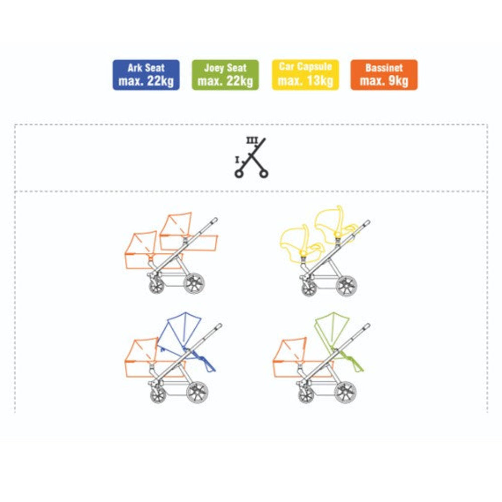 - Compact Fold – The ARK Stroller folds completely compact with both seats attached, making storage and transport effortless.