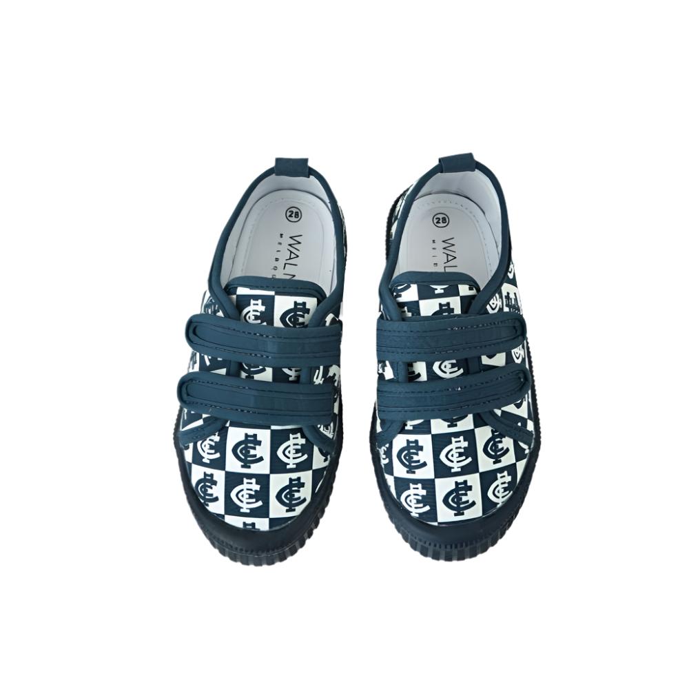 Featuring a custom-designed print inspired by the iconic navy blue and white colours of the Carlton Blues, these shoes are a true testament to the passion of AFL fans. With bold stripes and playful blue emblem motifs, they're sure to ignite the spirit of young fans everywhere. And with a custom-designed Walnut Melbourne outsole, every step is infused with comfort and style.