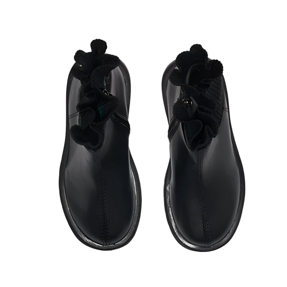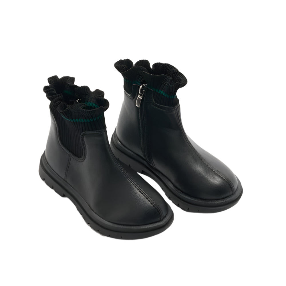 The Flora Boot is a stylish and versatile choice for your little one?s wardrobe. Crafted in sleek black faux leather, these boots feature a playful ruffle trim at the ankle for a fun and trendy touch. With an easy side zipper for quick on and off, these boots are perfect for both casual and dressed-up occasions. The cushioned sole provides all-day comfort, while the durable design ensures they?ll withstand plenty of adventures.